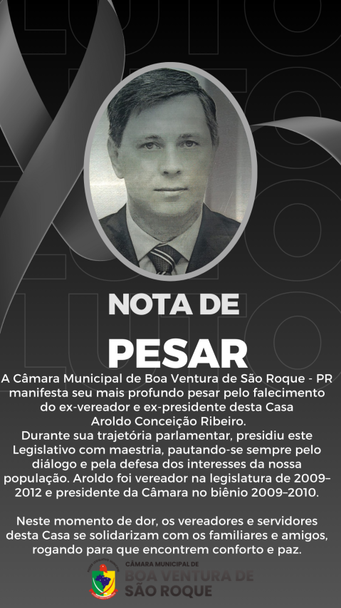 A Câmara Municipal de Boa Ventura de São Roque manifesta seu mais profundo pesar pelo falecimento do ex-vereador e ex-presidente desta Casa, Aroldo Conceição Ribeiro.